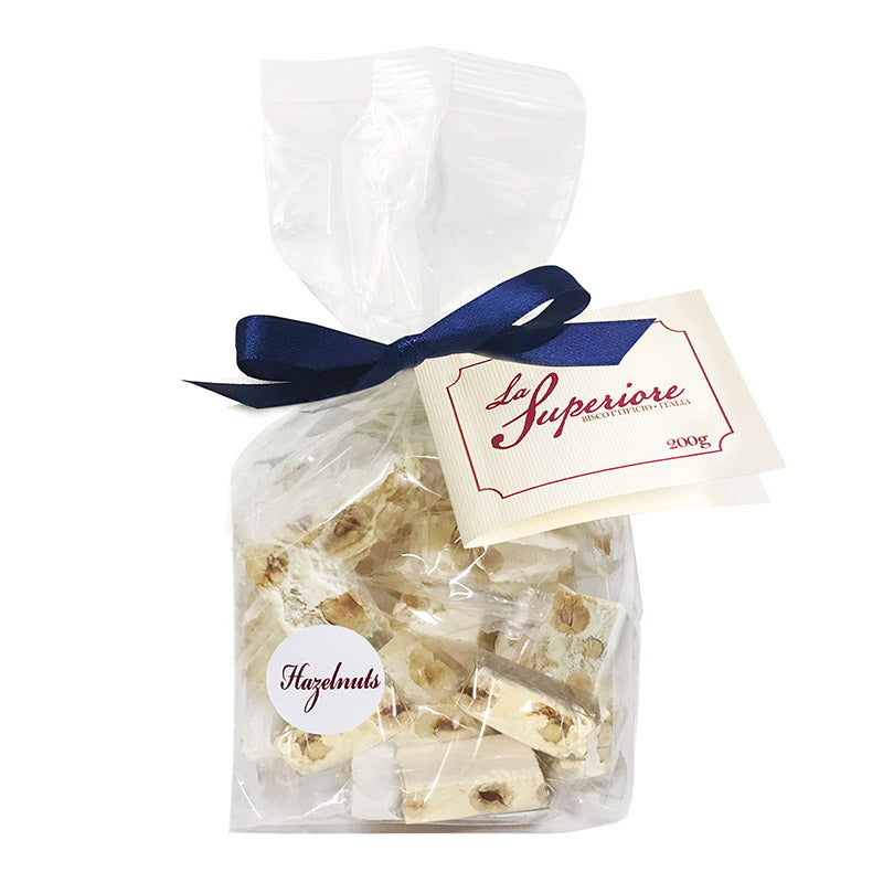 Experience the taste of Italian tradition with La Superiore's Hazelnut Nougat. Each soft, chewy piece is studded with whole roasted hazelnuts, creating a delightful mix of sweetness and crunch. Handcrafted with care in Italy and elegantly packaged with a navy ribbon, this 200g bag makes an ideal indulgence for yourself or a thoughtful gift for someone special. Simple, classic, and irresistibly delicious.