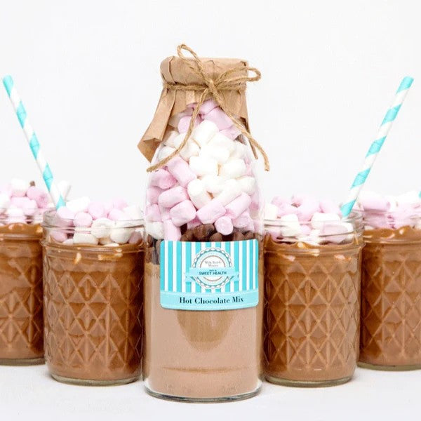 Each Mix contains our Signature Hot Chocolate Base Mix, topped with real Nestle Choc Bits and mini marshmallows, and dressed in our Signature label, Kraft paper topper, jute twine and an instructional swing tag (containing - ingredients, allergens, nutritional information and most importantly how to make method!).