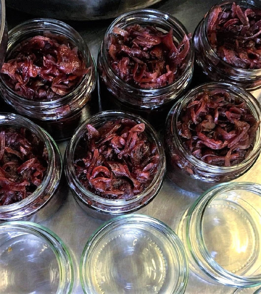 Red Onions, White Sugar, Brown Sugar, Vinegar and Red Wine.