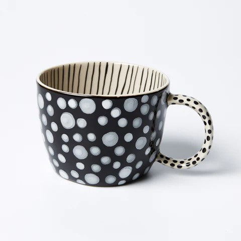 The Magic Pudding TamworthOur popular Chino mug is rendered here in cute white polka dots, featuring a black mini spot handle and a wiggly line interior. Each mug is crafted by hand and will be one of a kind. Holds 250ml
