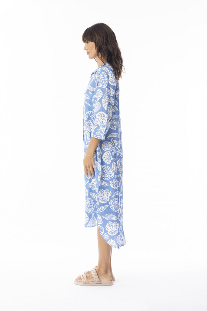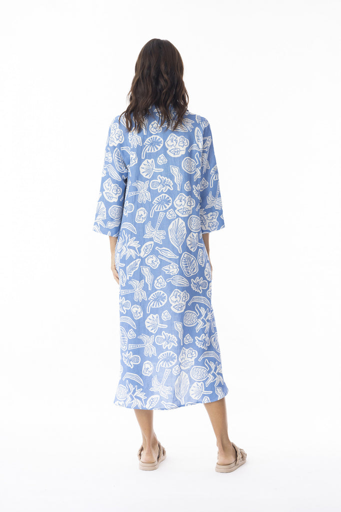 The Magic Pudding TamworthESCAPE BY OQ LINEN PRINT BLUE SHIRT DRESS MIDI