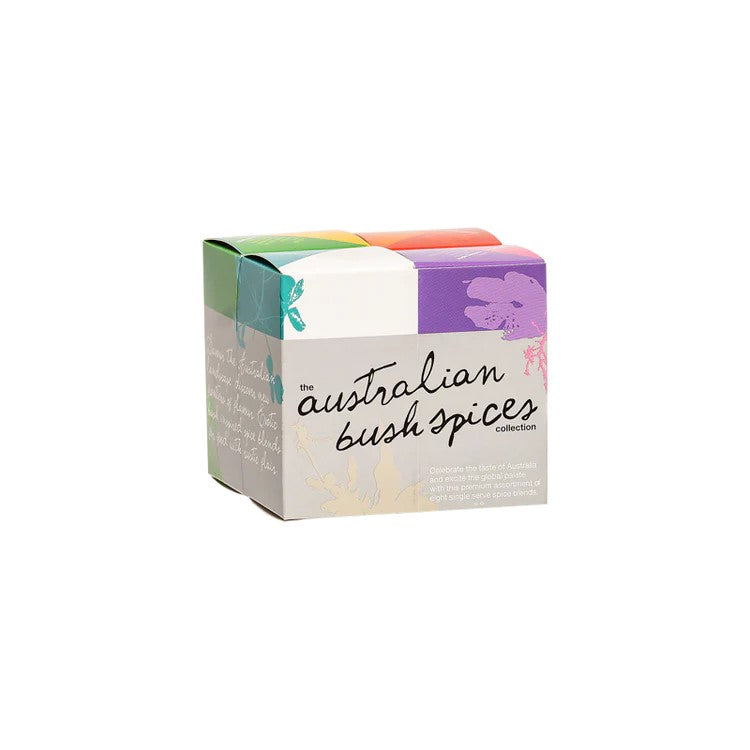 Includes 10g the following Spice Blends: Red Meat Rub, White Meat Rub, Seafood Rub, Bush Curry, Bush Dukkah, Salad Sprinkle, Sweet Cooking Spice, Sweet Dusting Spice.
