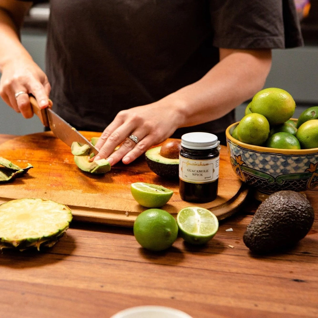 Our spice mix is a family favourite with versatile uses, and is the key ingredient in a flavourful, easy-to-make guacamole. Enjoyed with warm tortilla chips or in a taco. ¡Buen provecho!