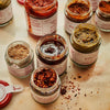 Arbol Chilli Flakes (30%), Aleppo Pepper Flakes (Red Pepper Flakes, Salt, Sunflower Oil) (26%), Chilli's, Chipotle Chilli Flakes (23%), Sea Salt, Ancho Chilli Powder, Olive Oil.