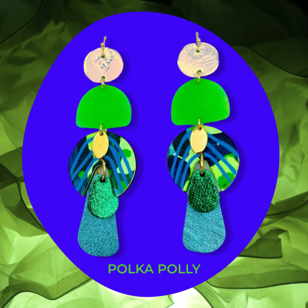 Gorgeous statement earrings in delicious blues, green, pearl and gold. Handmade using golden stainless steel hooks.