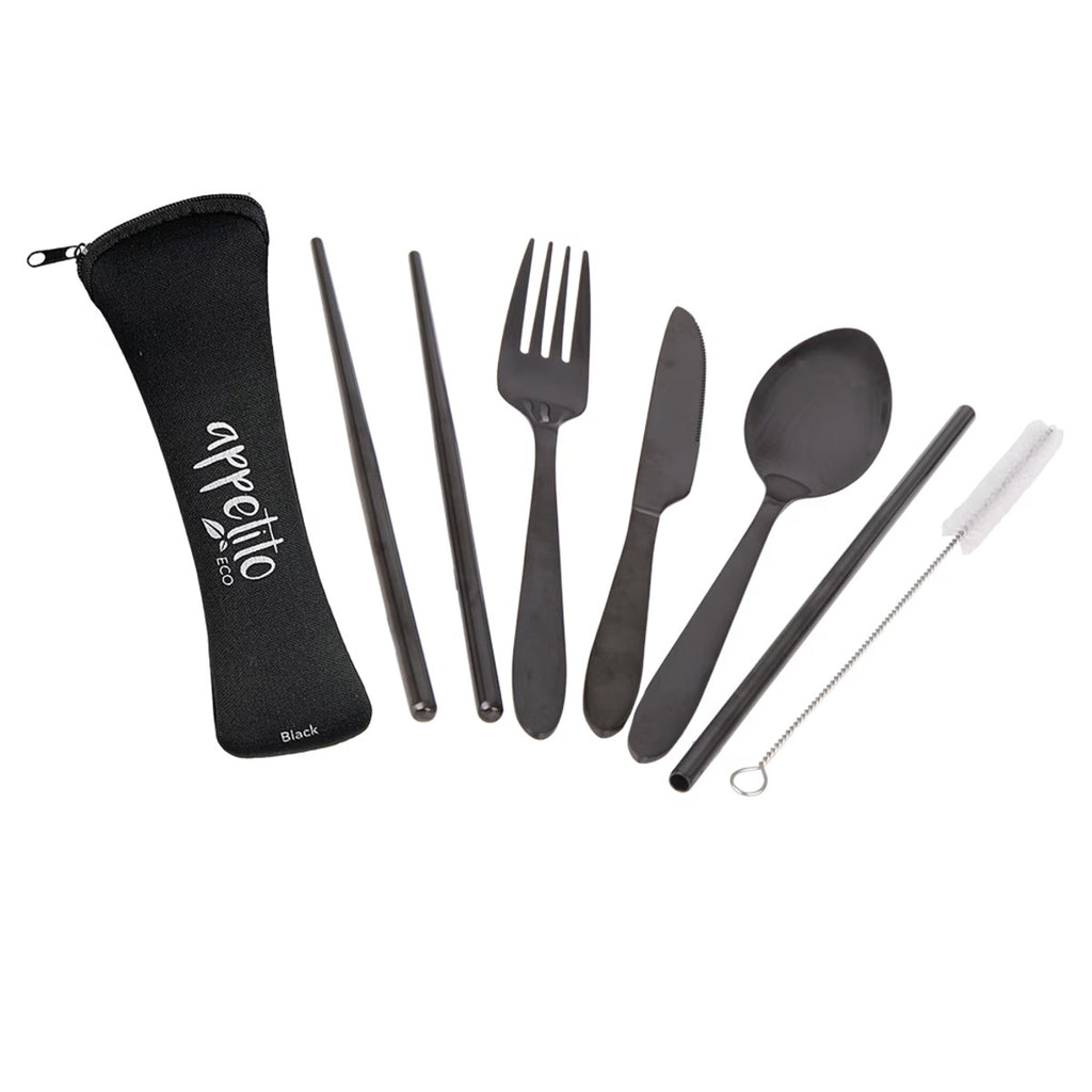 This set includes a knife, fork, spoon, set of chopsticks, drinking straw and straw cleaning brush in a handy, deluxe neoprene travel pouch, perfect for your handbag or backpack.