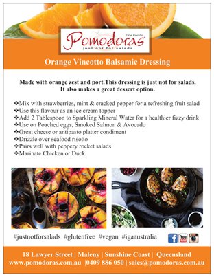 Our orange vincotto balsamic dressing is made with local orange zest and Australian port.  Again, this dressing is not just for salads.  It’s also makes a great dessert option