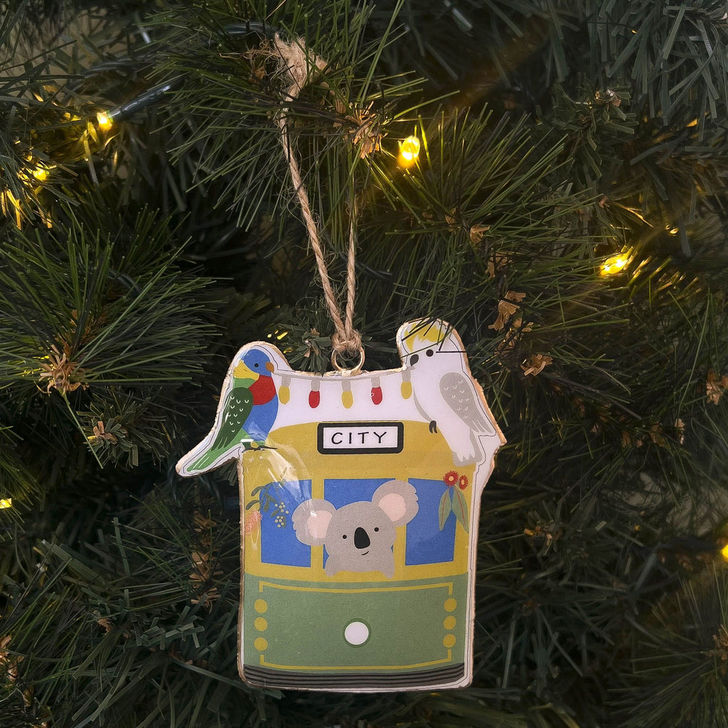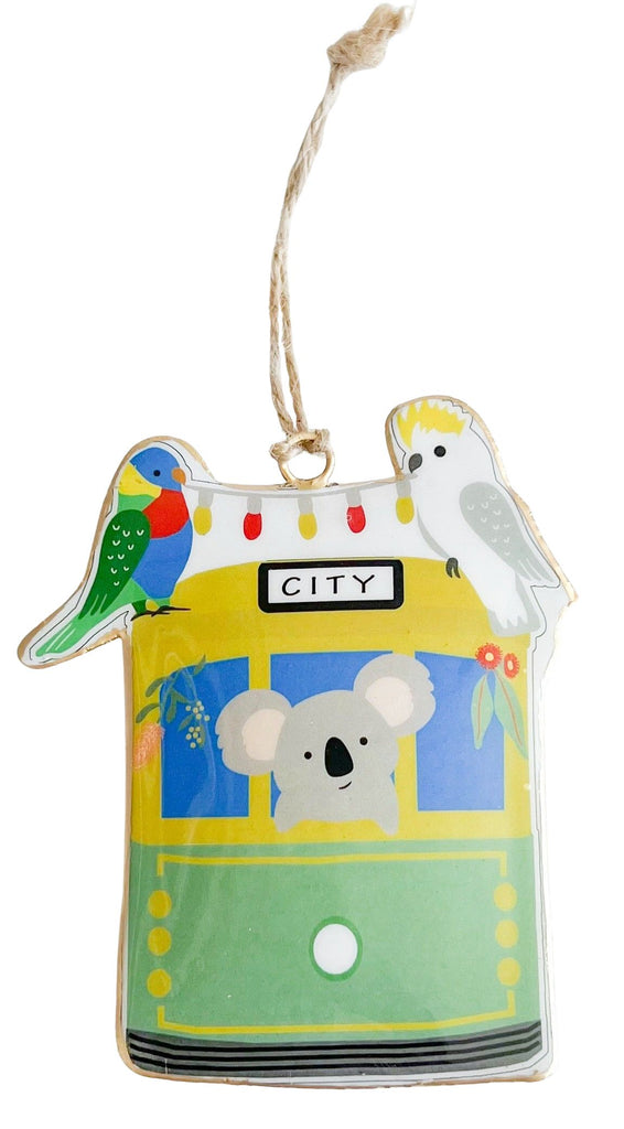 The Magic Pudding TamworthBring a touch of Aussie charm to your festive décor with the Oz Animals with Tram Metal Hanging Decoration. Featuring a bright green finish with cheerful yellow accents, this beautifully crafted metal ornament captures the whimsy of a classic Australian tram accompanied by adorable native animals along for the ride. Measuring H11 x 10 x 1 cm, it's perfectly sized to stand out on your Christmas tree, wreath, or seasonal display. Durable, lightweight, and full of personality, this decoration is ready to add a uniquely Australian twist to your holiday celebrations. Now in stock and ready to delight.