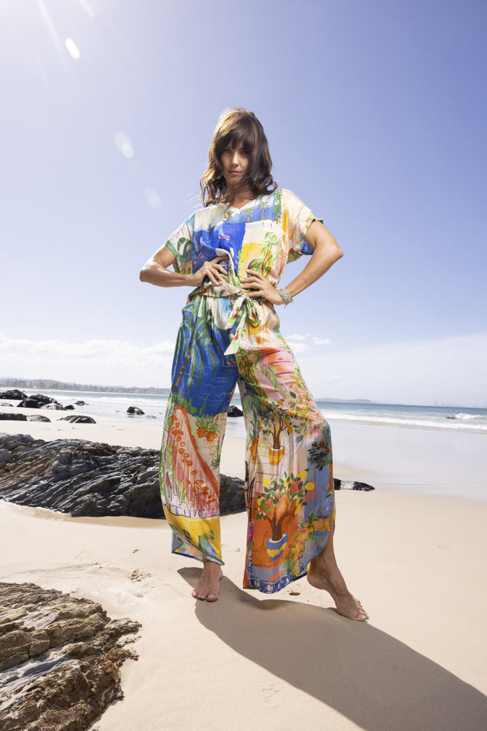 The Magic Pudding TamworthWrite your escape story in the story-woven Sardinia V Top. Featuring an open neckline, three-quarter gathered sleeves, vibrant colours, gorgeous waterscape and terracotta garden print, gathering at the waist, and a relaxed silhouette, this is the perfect top to throw on with a pair of our linen pants at the beach!