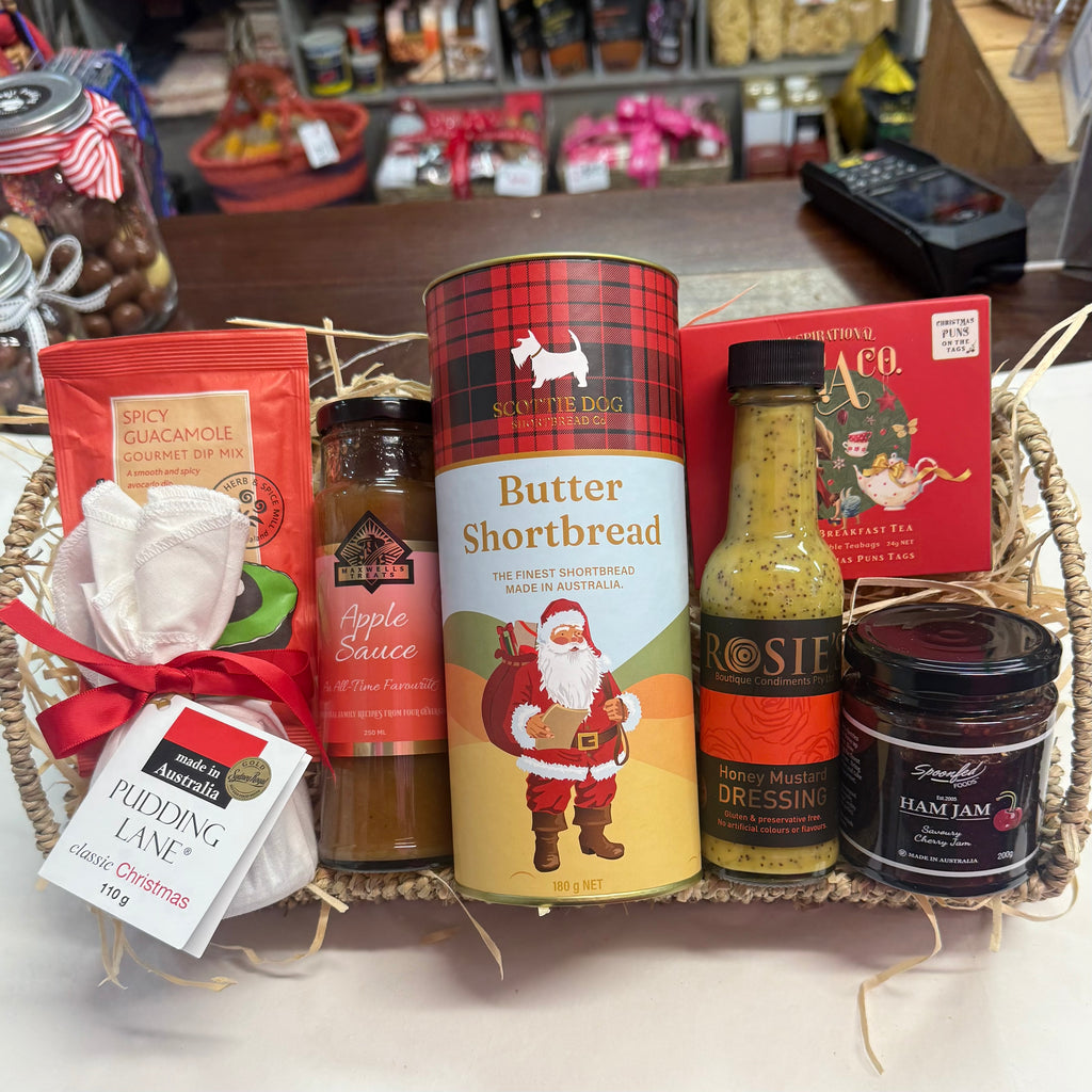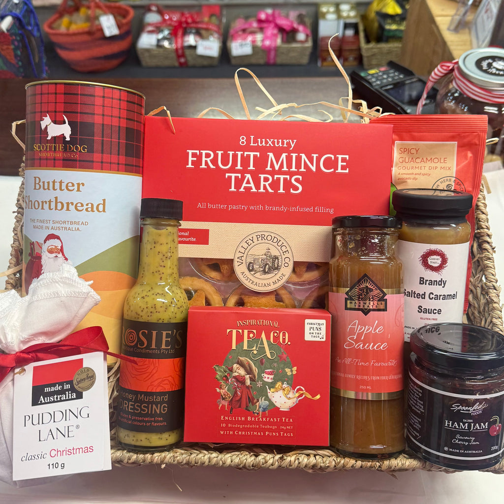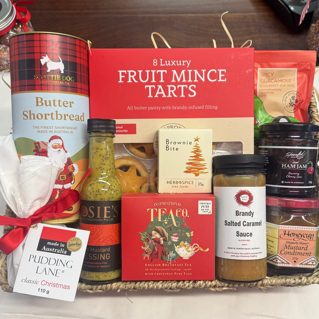 Brimming with Australian-made goodies—such as buttery shortbread, rich fruit mince tarts, Christmas pudding, gourmet sauces, festive teas, and indulgent sweets—this hamper captures the warmth, flavour, and nostalgia of a true Christmas celebration.