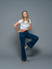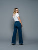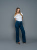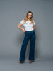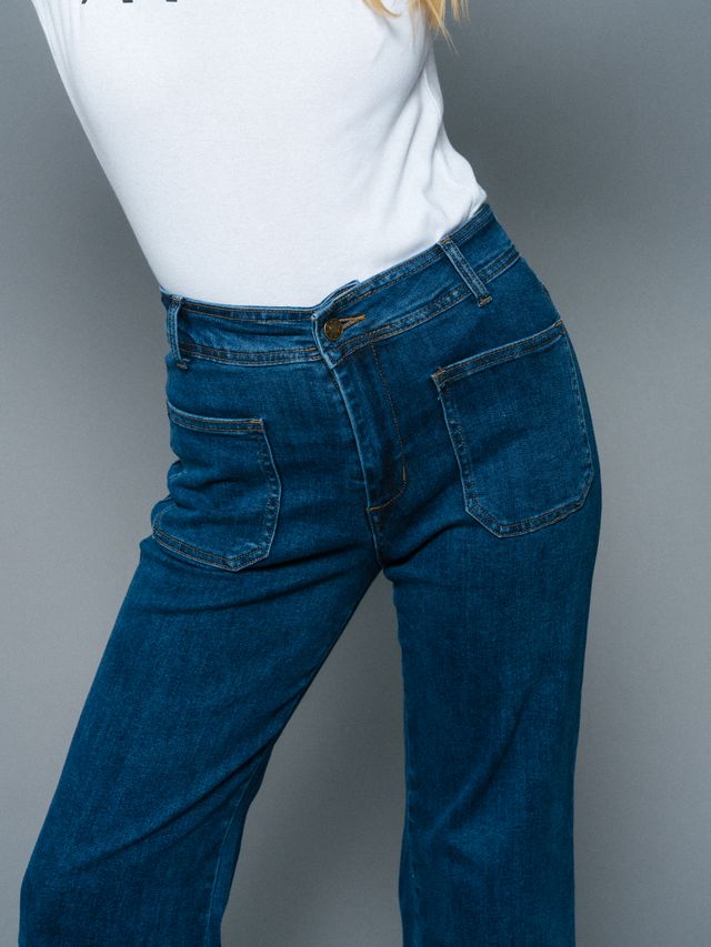 The high-rise waist and wide-leg cut create a clean, balanced silhouette, while the carefully placed back pockets enhance the natural line of the body. Finished in a deep, timeless denim wash with refined stitching, these jeans are a wardrobe essential made to be worn season after season.
